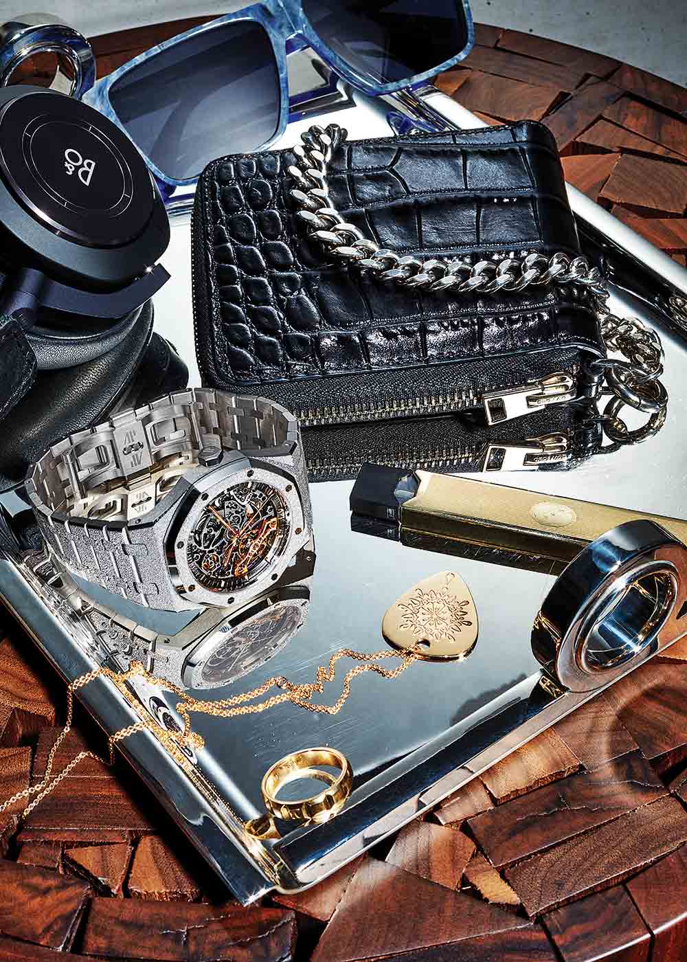 Đồng hồ Audemars Piguet Royal Oak Frosted Gold Double Balance Wheel (thewatchbox.com); Tai nghe Bang & Olufsen Beoplay H9 (bang-olufsen.com); Kính râm Louis Vuitton (louisvuitton.com); Ví da cá sấu Tom Ford kèm dây xích (tomford.com); Vỏ hộp vape bằng vàng 18k của Miansai (miansai.com); Dây chuyền vàng 18k của Jenny Dee (jennydeejewel.com); Nhẫn vàng 18k của Boucheron (boucheron.com); Khay mạ bạc Puiforcat (puiforcat.com).
