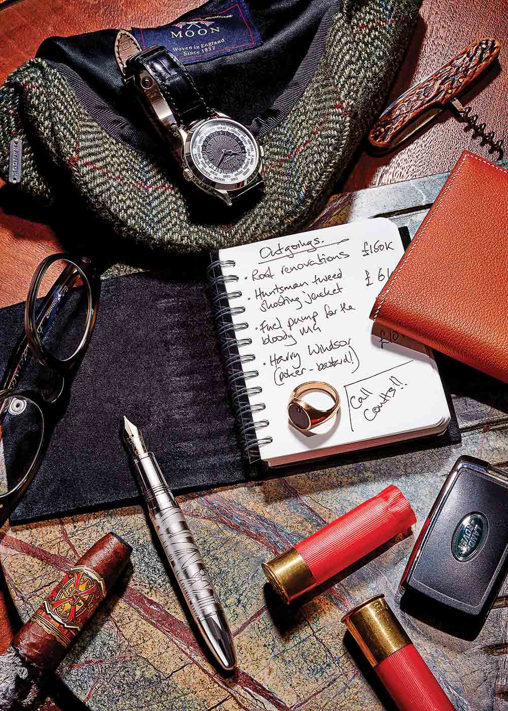Đồng hồ Patek Philippe World Time bằng vàng trắng (patek.com); Nón len Kangol (kangol.com); Ví da bê Hermès (hermes.com); Nhẫn vàng 18k mặt hình triện của Rebus (rebussignetrings.co.uk); Key fob của Land Rover (landrover.com); Bút máy phủ bạch kim Montblanc (montblanc.com); Kính bespoke E. B. Meyrowitz (ebmeyrowtiz.co.uk); Sổ ghi chép và bìa da của Hermès (hermes.com); Mặt đá cẩm thạch của Tom Dixon (tomdixon.net).