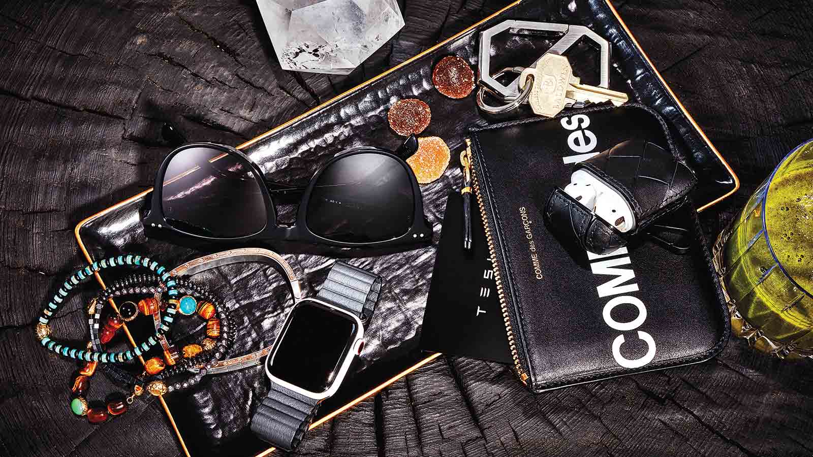 Đồng hồ Apple Edition Series 5 (apple.com); Vòng tay nam bằng vàng 18k và thép của Roberto Coin (robertocoin.com); Vòng tay đính cườm hạt đá hematit, mắt hổ, ngọc lam và đá onyx của Luis Morais (luismorais.com); Kính râm Celine (celine.com); Móc khóa Hermès bằng thép không gỉ (hermes.com); Ví da Comme des Garçons (shop.doverstreetmarket.com) với thẻ chìa khóa Tesla (tesla.com); Bao AirPods bằng da của Bottega Veneta (Bottegaveneta.com) với Apple AirPods (apple.com); Khay sứ bọc da cá sấu L’Objet (l-objet.com).